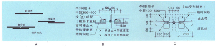 止水带接头必须粘接良好,可参考图示(如图A)、如施工现场条件具备,可采用热硫化连接的方法。不加任何处理的所谓“搭接”是绝对不允许的。